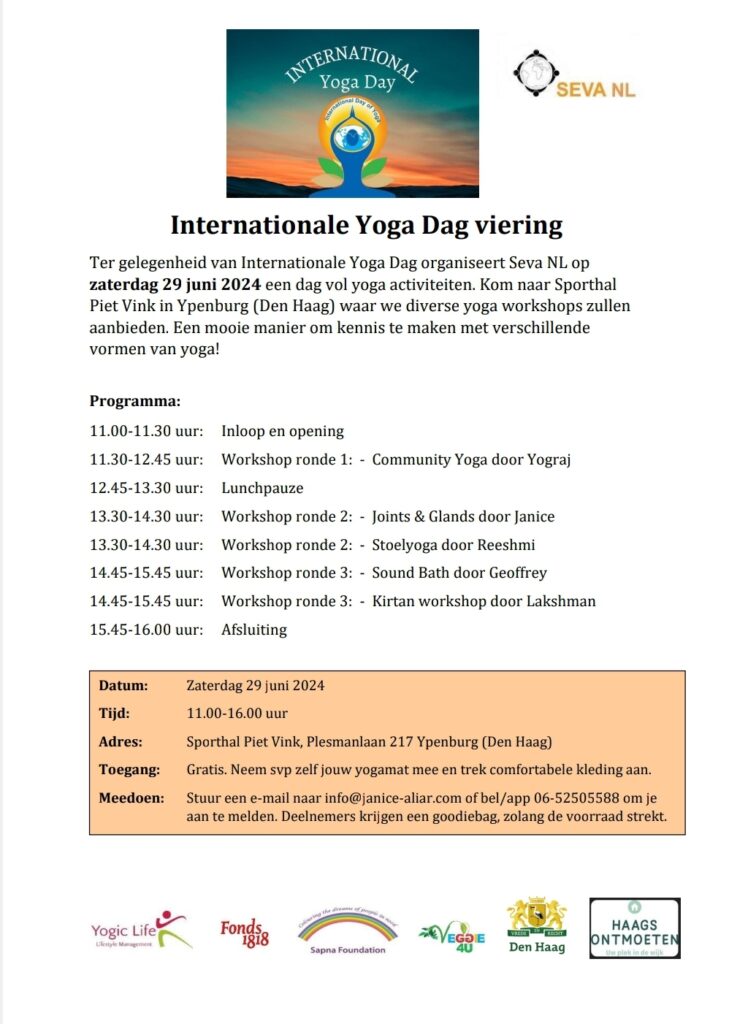 Ter gelegenheid van Internationale Yoga Dag organiseren we op zaterdag 29 juni 2024 een dag vol yoga activiteiten. Kom naar Sporthal Piet Vink in Ypenburg (Den Haag) waar we diverse yoga workshops zullen aanbieden. Een mooie manier om kennis te maken met verschillende vormen van yoga!